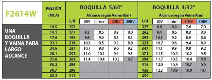 Es la combinación que mejor pulverización consigue, pero también proporciona el menor radio de alcance. Utilizada para presiones extremadamente bajas (14 mca). |